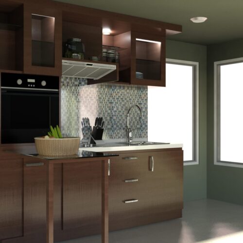 Vaastu Arsitektur Studio – Kitchen set kali ini adalah desain yang mengusung tema kombinasi antara fungsi kitchen/dapur dengan meja makan untuk rumah mungil Ibu Yudith